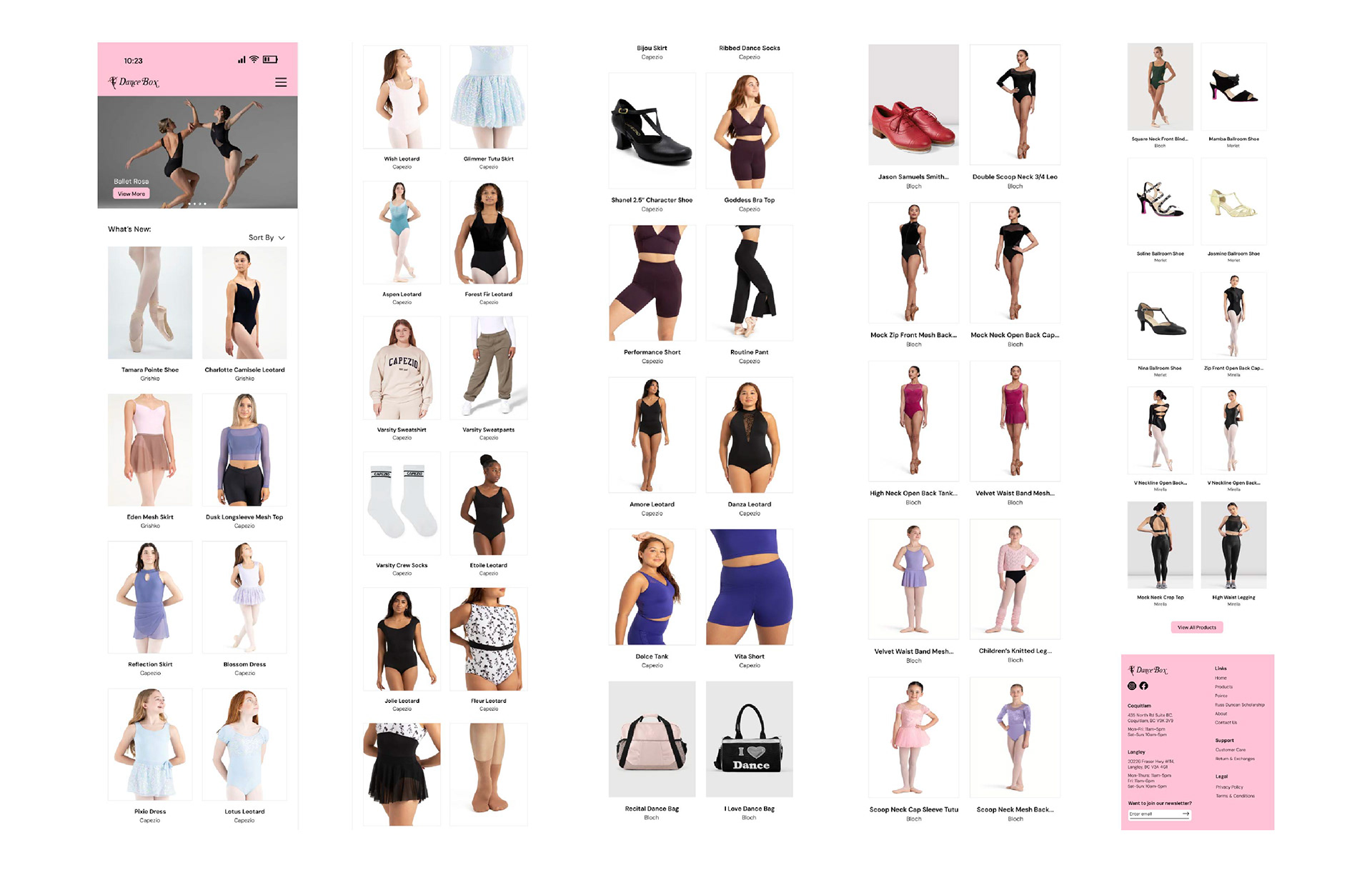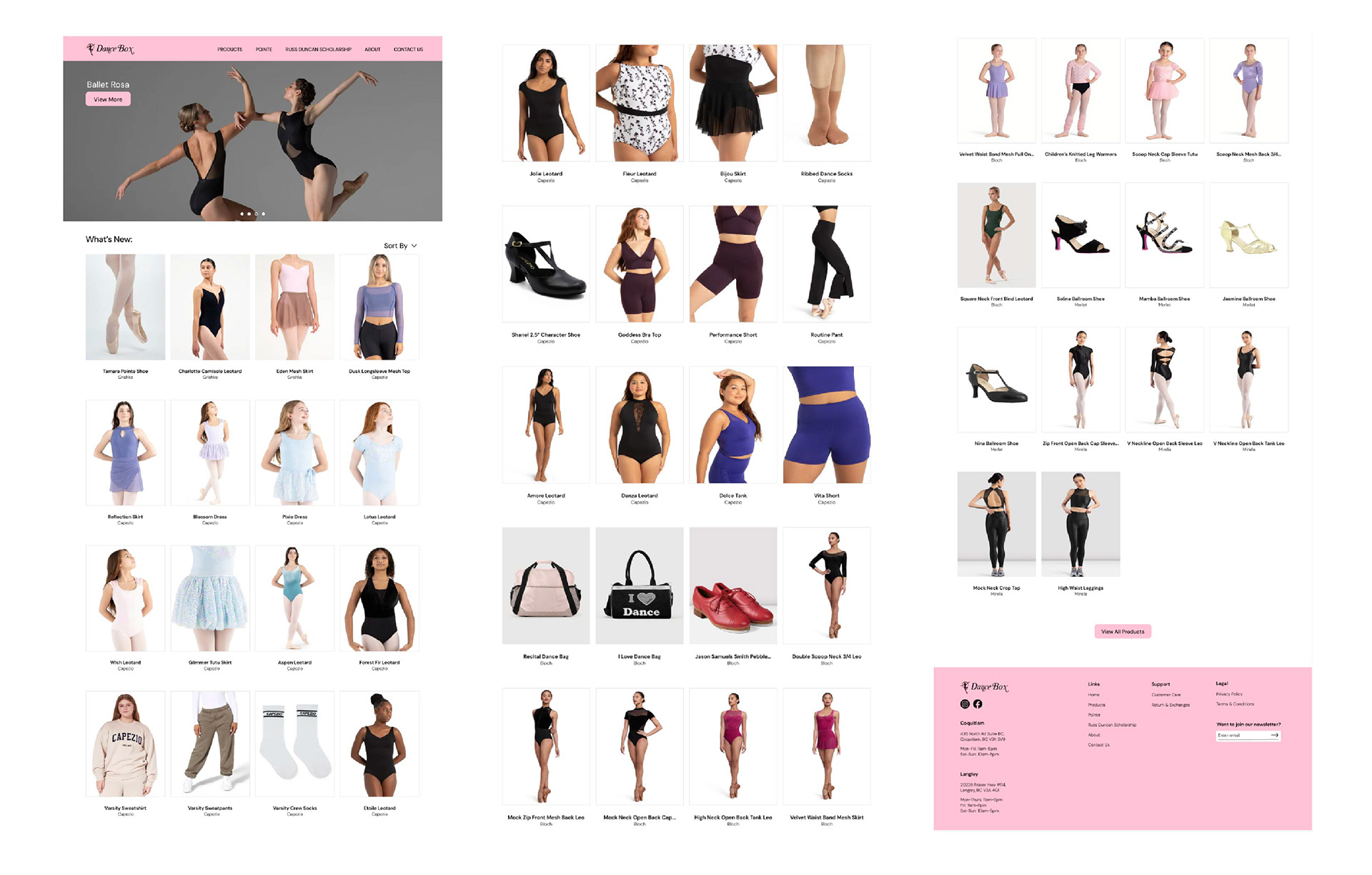 The Dance Box web design case study focused on re-working and improving an existing dancewear store website. It was an individual project where I was able to practice optimizing the user experience and improve the platform’s efficiency. Using Figma, I redesigned two full desktop pages and their mobile versions.