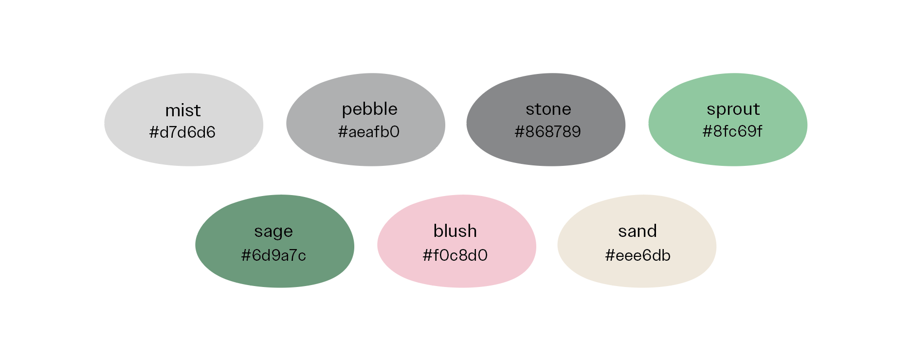 This colour palette represents the brand well. The three greys along with the two greens are meaningfully used in the logo - greys representing the stones, and greens representing the sage. The colours "blush" and "sand" are secondary colours and help tie in the rest of the brand identity and collateral in a soothing fashion.